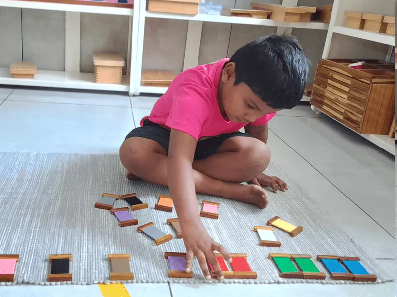 Developing the chromatic senses allows a child to learn perceived differences between primary and secondary, as well as the various gradations of each. The color lessons also aim to develop a child’s ability to recognize similarities and differences in colors and order.