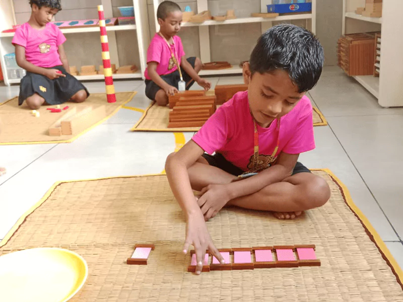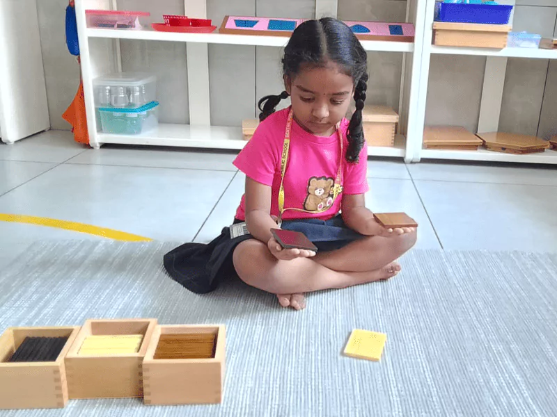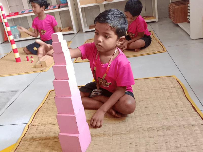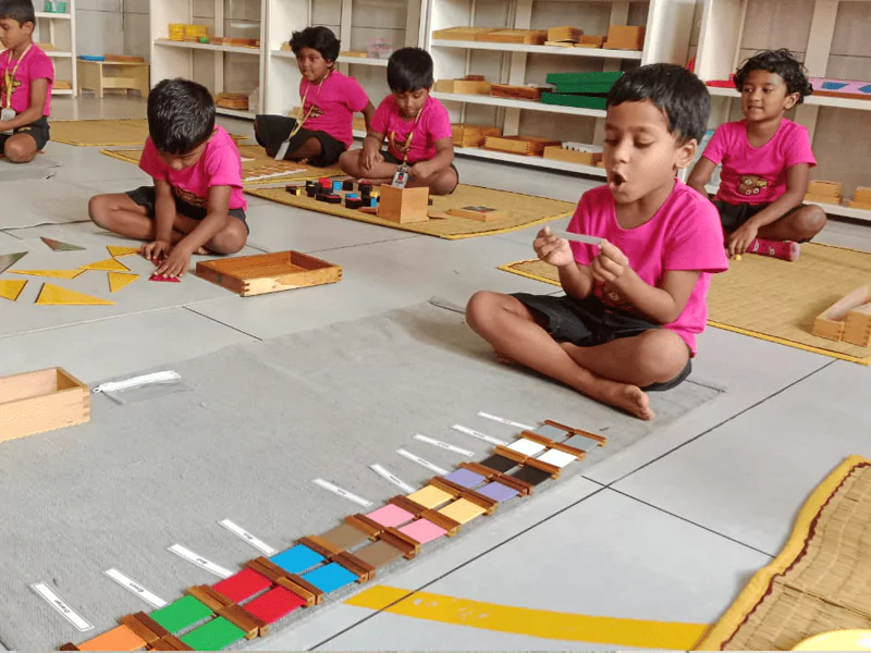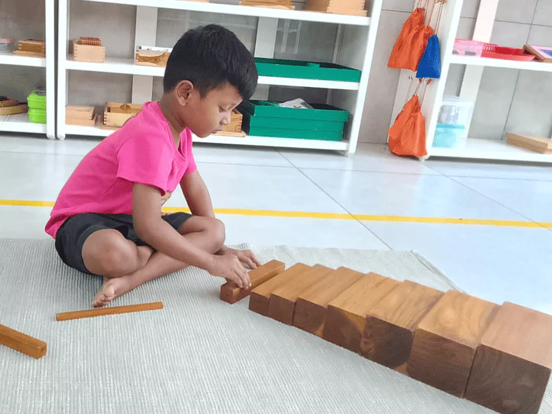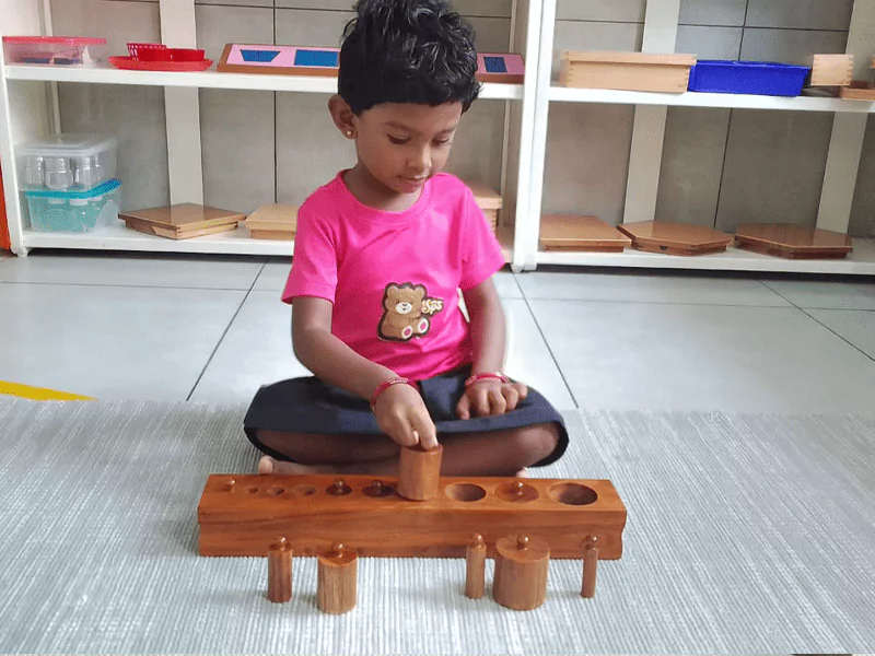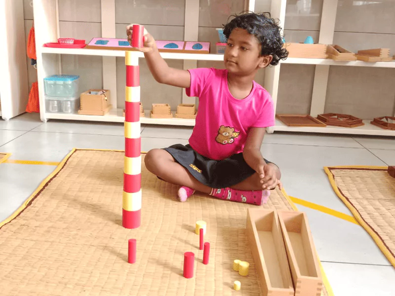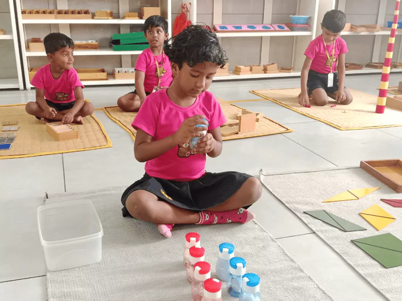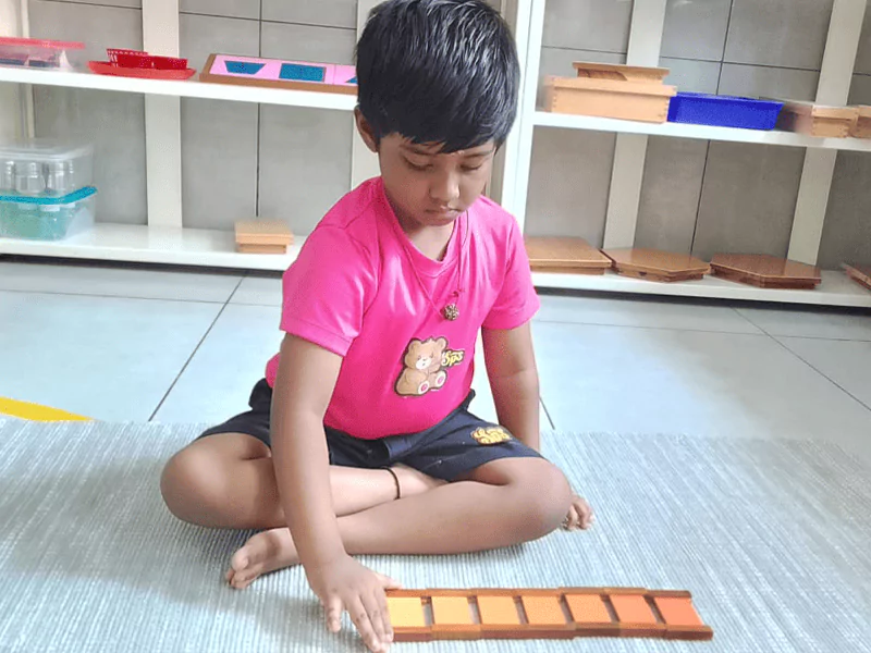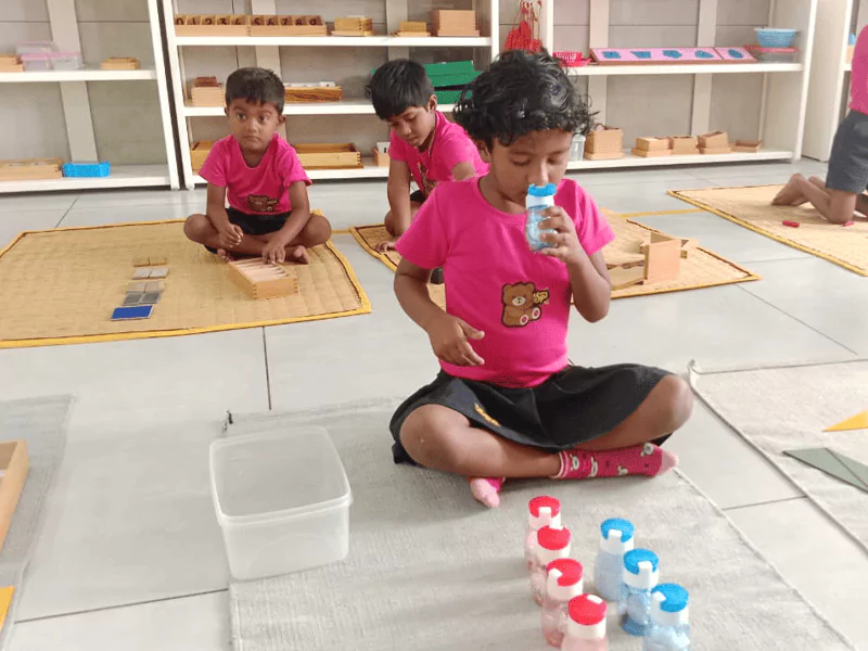 The sensorial materials are designed with built-in feedback to control errors aimed to show when a mistake has been made. Children are encouraged to be independent of oversight which develops their self-confidence and incentive to practice and improve. A child’s sense perceptions will become structured and capable of comprehending abstract concepts through experiencing sensorial lessons. The sensorial area is divided into six categories: size, form, color, tactile, gustatory, olfactory, and auditory.