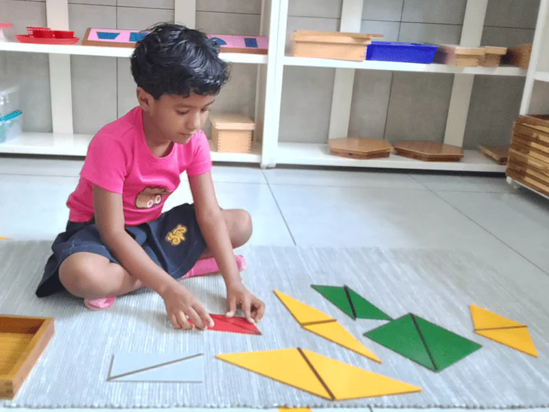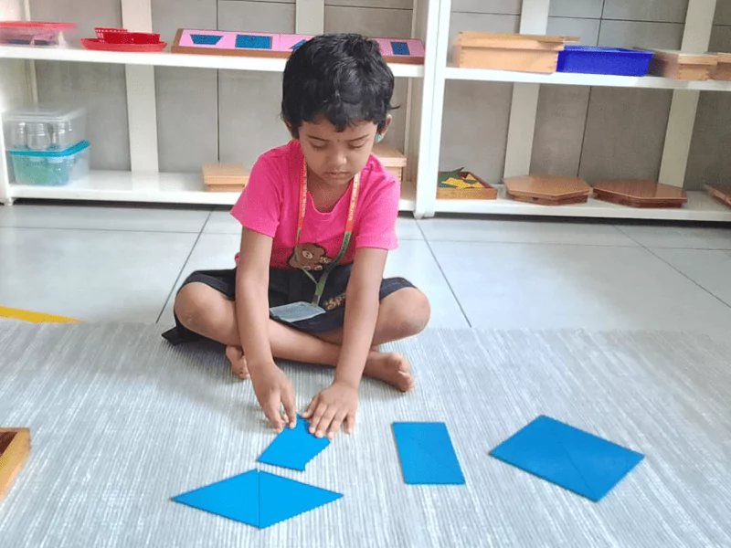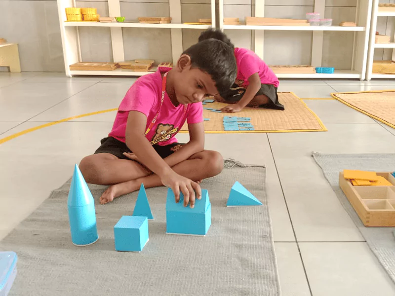 Geometric lessons help develop the child’s visual discrimination in shape and form. Additionally, a child develops the ability to observe progression from concrete to more abstract forms, all while the child learns the various figures. Indirectly, these lessons prepare the child for writing.